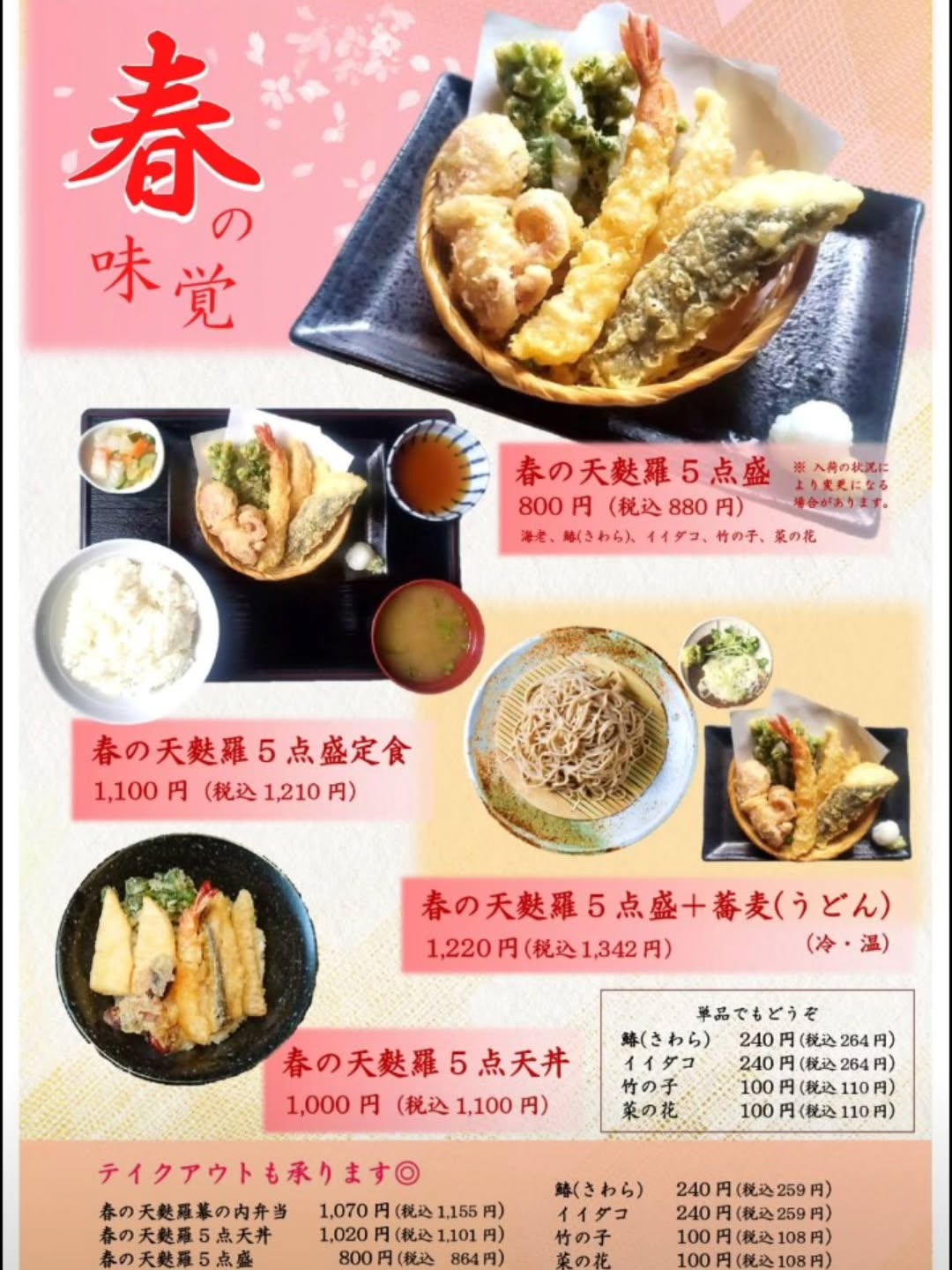 江戸前天麩羅 天堂です! 春の味覚メニュー 鰆(さわら)、いいだこ、タケノコ、菜の花 季節を感じる天麩羅をご賞味ください! #町屋グルメ #町屋居酒屋 #町屋レストラン#町屋ランチ#町屋ディナー